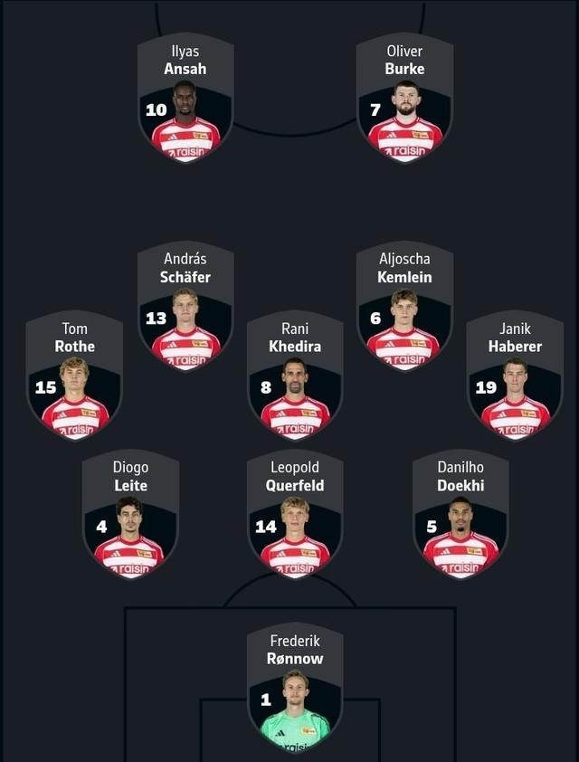 柏林联合首发:1-容诺夫、5-多克希、14-克尔费尔德、4-迪奥戈-莱特、19-哈勃勒、6-凯姆莱因、8-拉尼-赫迪拉、13-舍费尔、15-汤姆-罗特、7-伯克、10-安萨